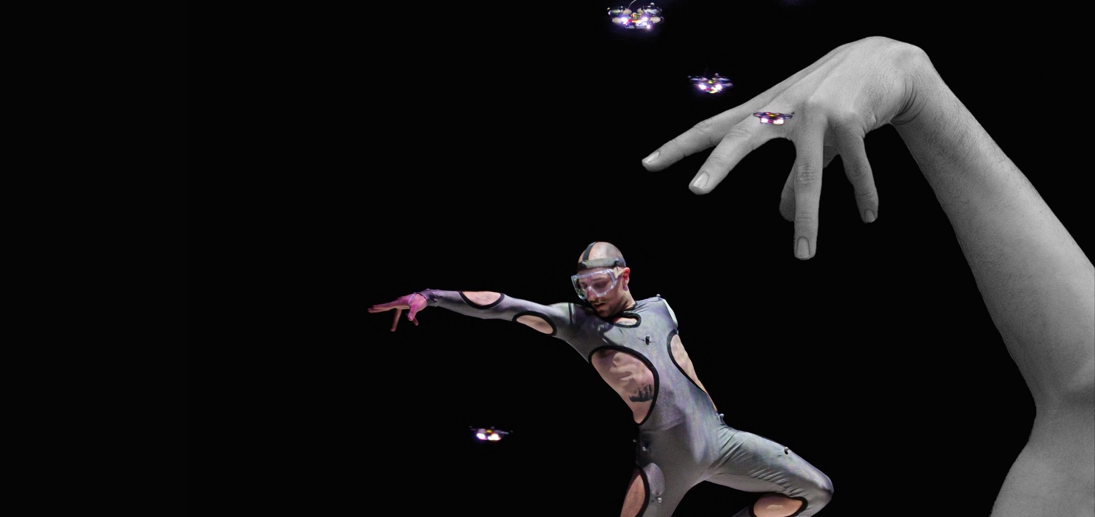 Zoals altijd bij Another Kind of Blue speelt technologie een belangrijke rol, maar hier is ze subtieler aanwezig — als verlengstuk van het lichaam. Virtuele handen bewegen mee via motion capture, terwijl in het werk Arms drones samen een bovenlijf vormen dat reageert op improviserende dansers. Zo ontstaat een directe dialoog tussen mens en machine, waarin technologie niet alleen ondersteunt, maar zelf lijkt mee te voelen. En in Flyland (2016) lijken dansers door de lucht te vallen, gevangen en voortgestuwd door hun eigen schaduwen. Licht en projectie worden hier een danspartner die de wetten van de zwaartekracht opheft en de grenzen van het lichaam vervaagt.